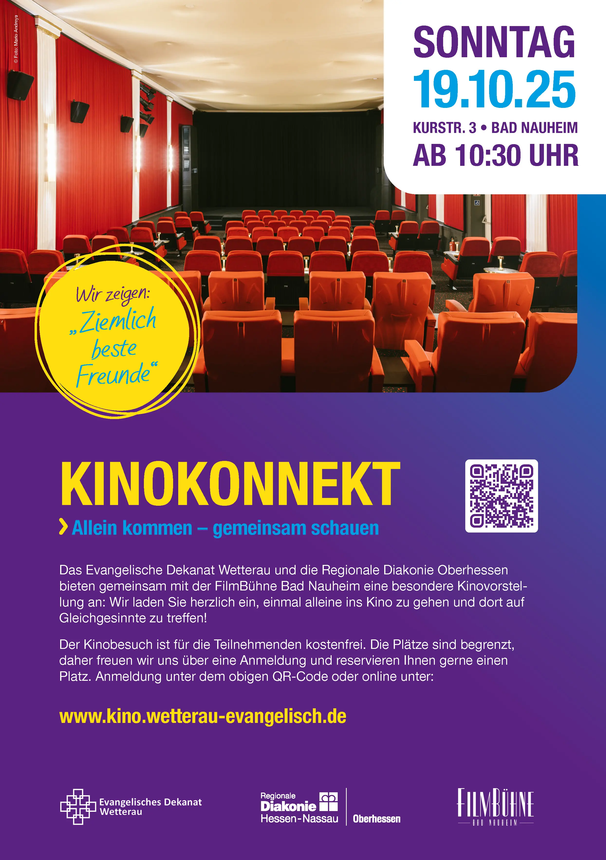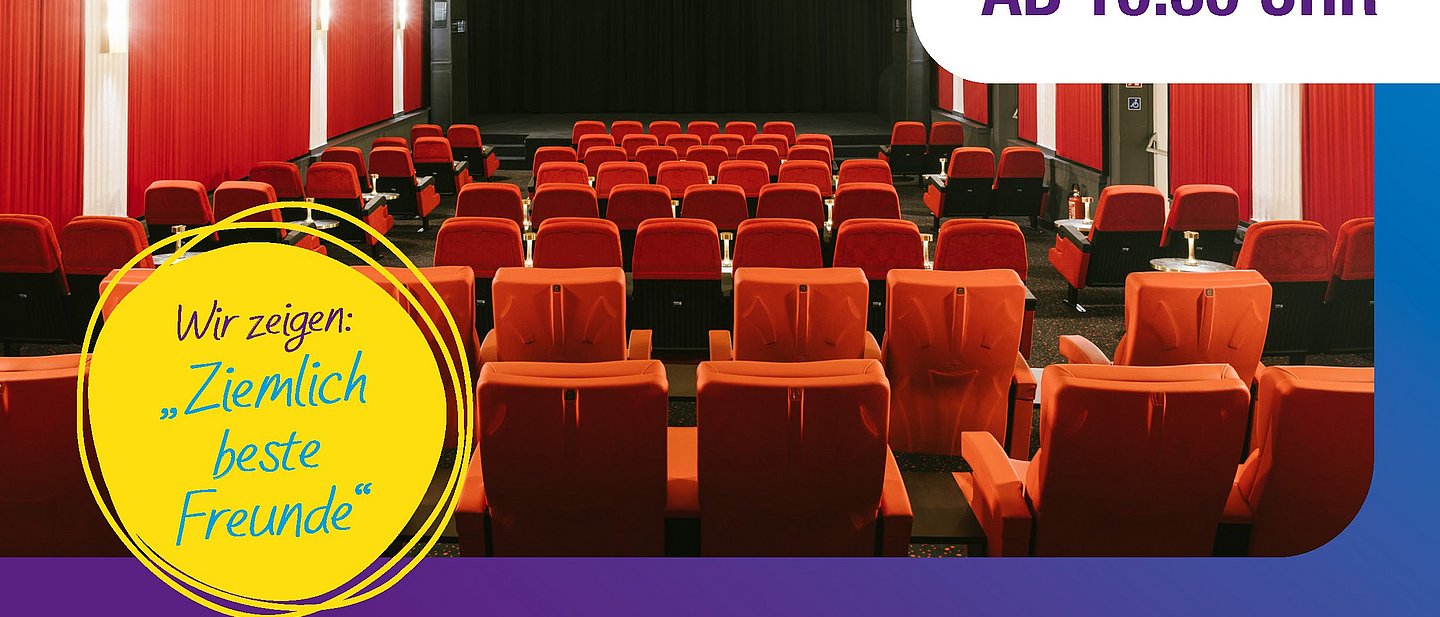 Das Evangelische Dekanat Wetterau und die Regionale Diakonie Oberhessen bieten gemeinsam mit der FilmBühne Bad Nauheim eine besondere Kinovorstellung an: Am Sonntag, 19. Oktober, laden die Veranstalter herzlich ein, einmal alleine ins Kino zu gehen und dort auf Gleichgesinnte zu treffen. Los geht es ab 10.30 Uhr. Dann ist Zeit zum Ankommen und Kennenlernen. Um 11 Uhr startet der Kinofilm. Gezeigt wird der französische Filmklassiker “Ziemlich beste Freunde”. Im Anschluss an die Vorstellung wartet ein kleiner Imbiss auf die Teilnehmenden.