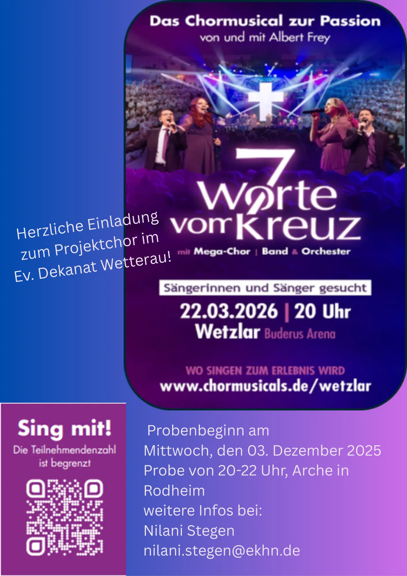 Am 22. März 2026 wird in der Buderus-Arena in Wetzlar das Chormusical „7 Worte vom Kreuz“ aufgeführt. Dekanatskantorin Nilani Stegen wird bei der Aufführung einen Teil des Chores dirigieren.In den vergangenen Jahren haben bereits „Bethlehem“ und „Martin Luther King“ beeindruckt. Die Idee ist, dass Chorsängerinnen und -sänger sich im Rahmen eines Projektchors gemeinsam darauf vorbereiten. Alle interessierten Sängerinnen und Sängern aus dem Dekanat sind herzlich eingeladen mitzusingen. Die Proben dafür beginnen am Mittwoch, den 03.12., immer von 20 bis 22 Uhr in der Arche in Rodheim. Alle Interessierten können sich bei Nilani Stegen unter Tel. 06101 501249, Nilani.Stegen(at)ekhn.de melden.