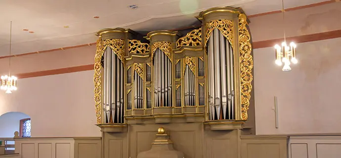 Die Orgel im Monat Dezember steht in der Evangelischen Kirche in Assenheim und verbirgt von außen ihr wahres Gesicht.