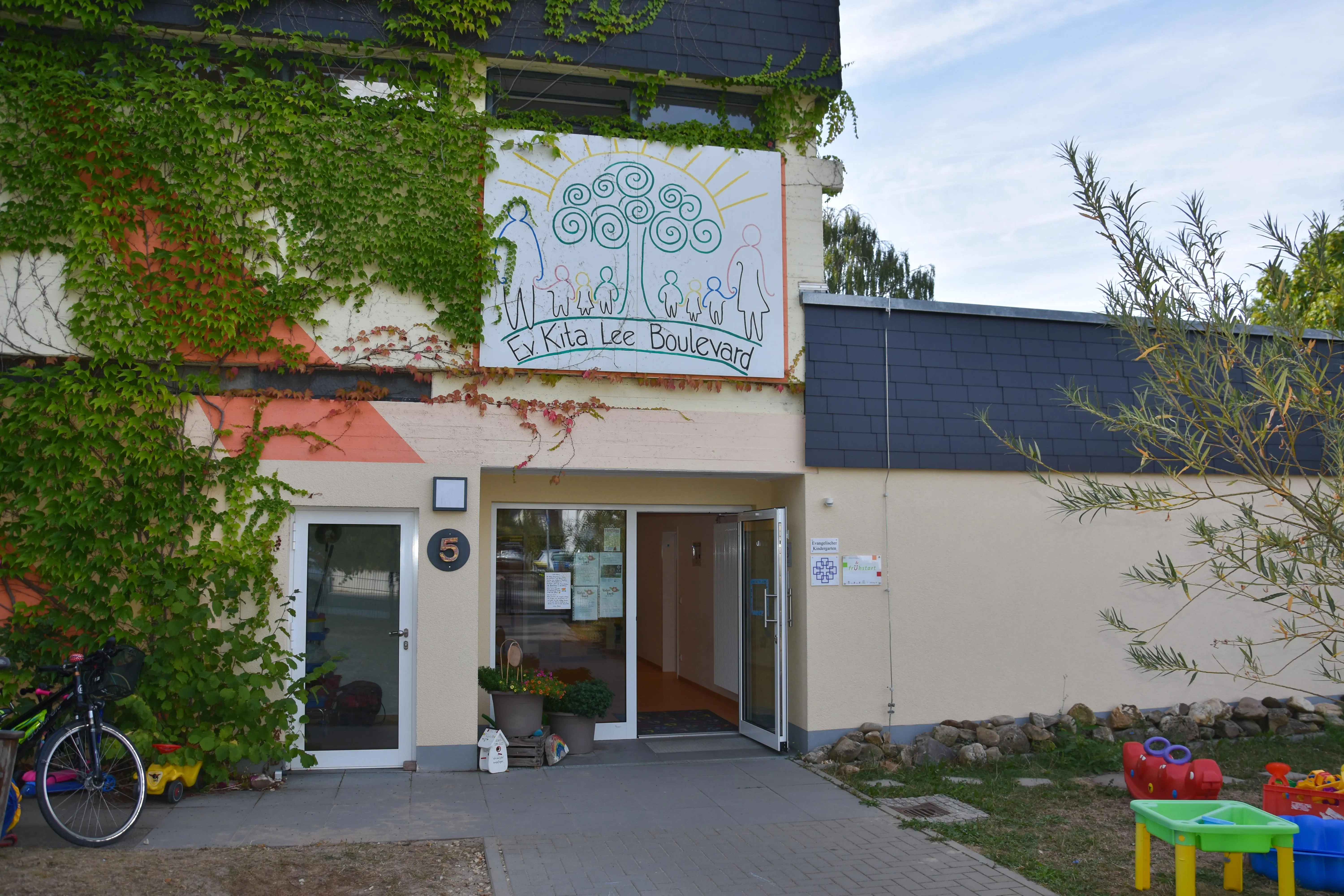 Das Schild am Eingang der Ev. Kita Lee Bouelvard in Bad Nauheim greift de Gemeinschaftsgedanken auf.