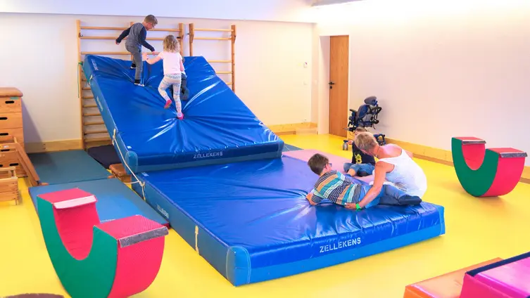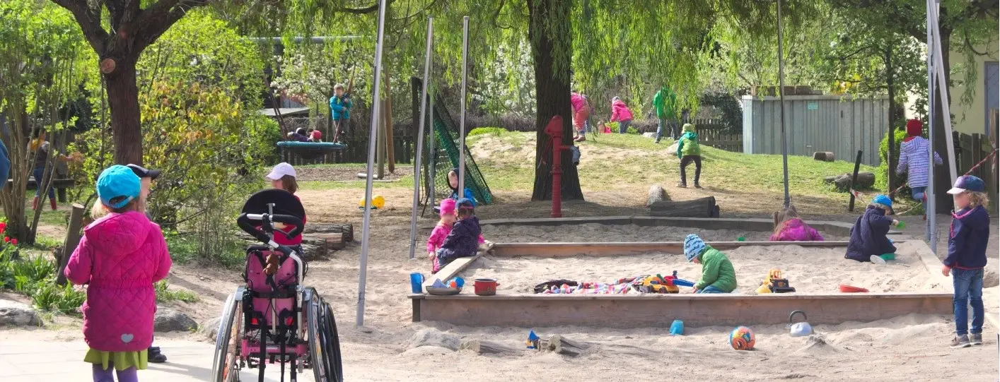 Im großen Garten der Evangelischen Integrativen Kindertagesstätte Massenheim steht ein Rollstuhl zwischen Sandkasten und Schaukel. Er deutet an, was in der Kita ganz normal ist: Kinder mit und ohne Behinderungen und Entwicklungsbeeinträchtigungen spielen und lernen zusammen.